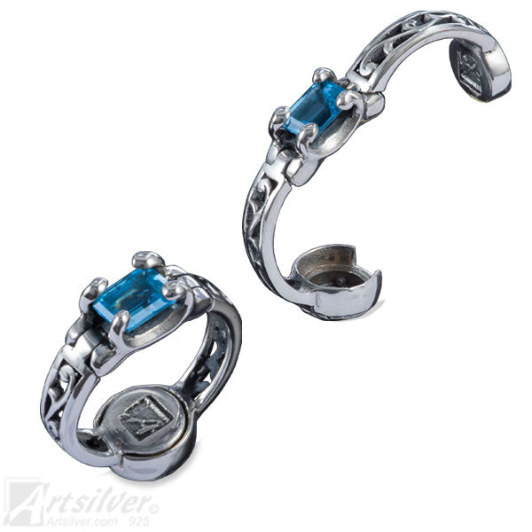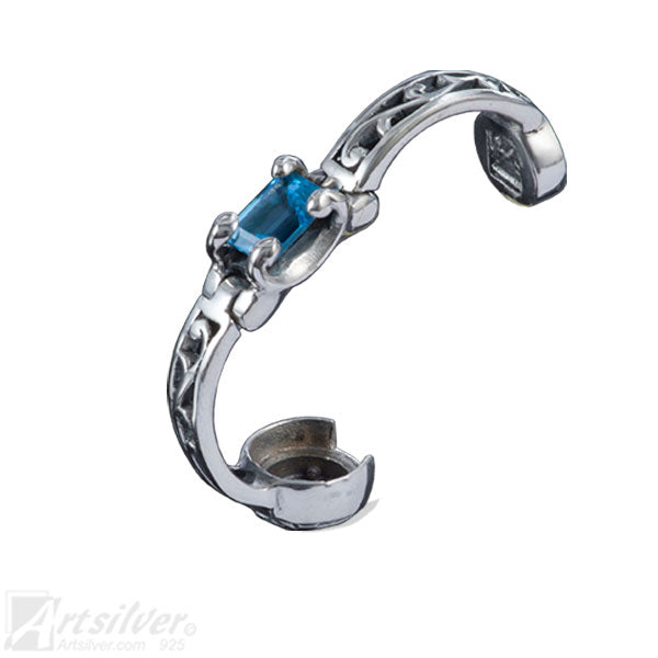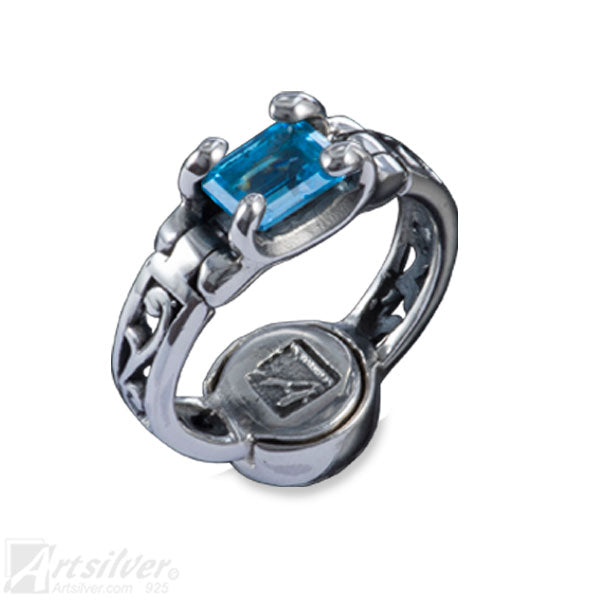 The band on this ring is so detailed that it honors the center gemstone. Lacy detail on both sides of the band lead to the center stone. The gemstone is held in place by horseshoe shaped silver prongs. The back of the band has a circular silver piece that has a magnet on one side and the other side fits in easily when they connect. Available in Blue topaz.
