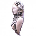 This unique brooch/pendant shows a female side profile. An 18 karat gold plated hibiscus flower and round cabochon cut garnet accents her hair.