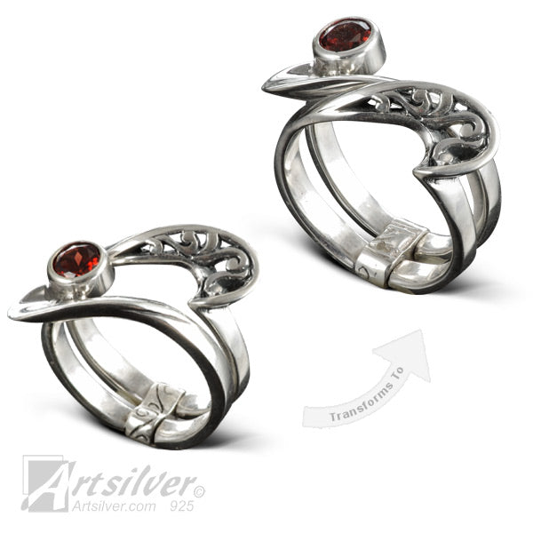 A Concave filigree half- moon, with a dramatic opening leads you to a bezel set garnet nestled in a swirl of polished silver. Make the switch and the garnet cits atop the joined filigree and polished pieces of silver. An affordable way to have two looks on your finger. Available in these Semi-precious Stones: Blue Topaz, Garnet, Amethyst, White Pearl, Black (peacock) Pearl, and Black Onyx