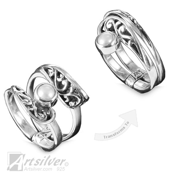 Flip the ring and the two bars are joined in a narrow dome like silver filigreed bar with the pearl at the bottom.