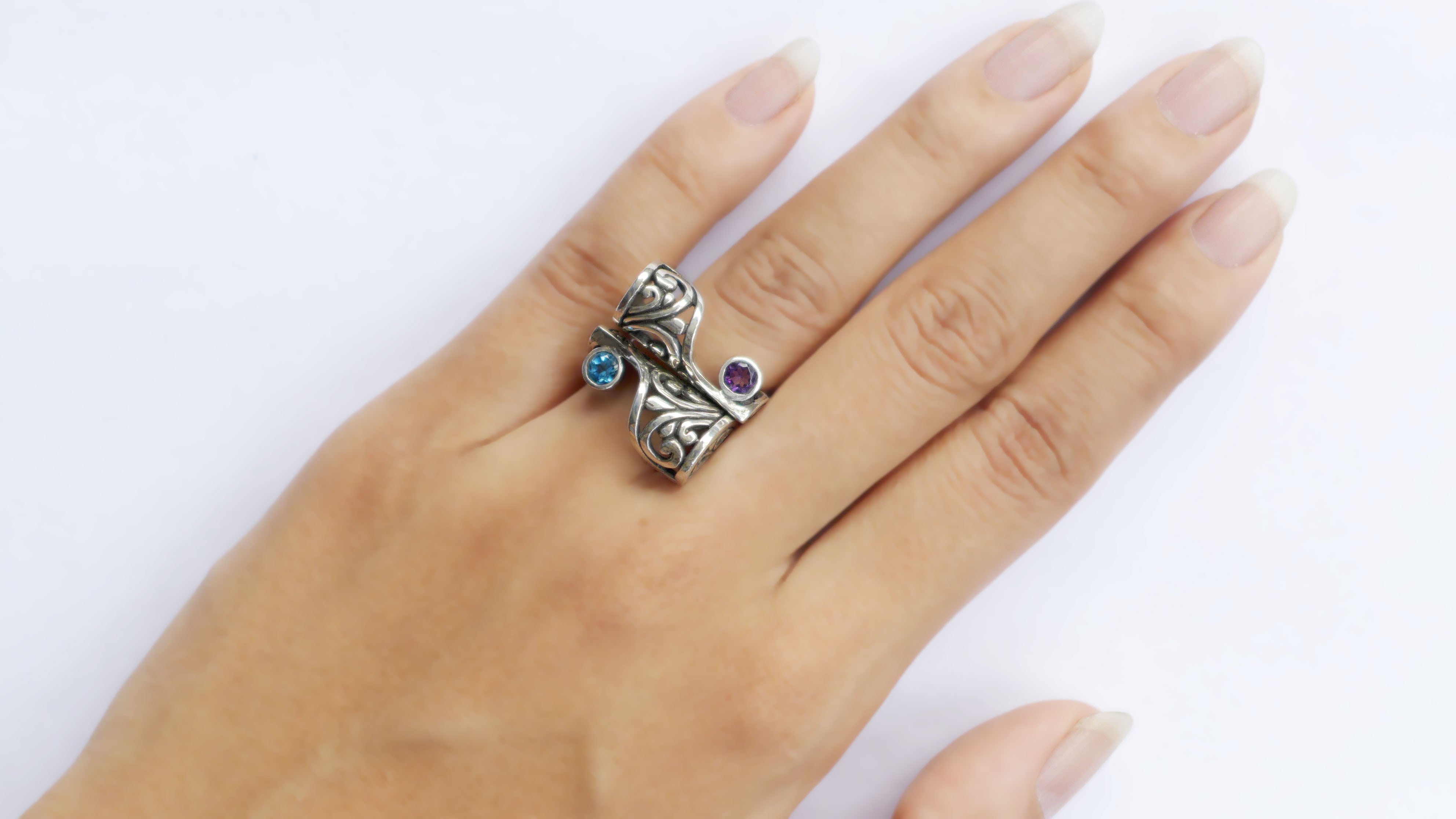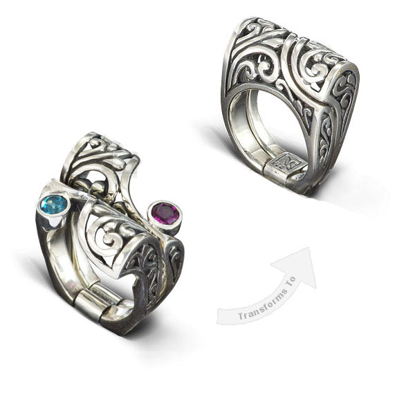 This sterling silver ring opens like a treasure box to reveal semi- precious stones.