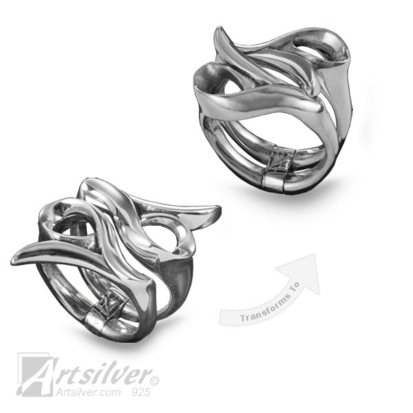 This ring has a free form style. But it has a resemblance to a flower with an outside leaf on the bottom and the top places the flower in the opposite direction. Done in high polished silver it is a conversation piece