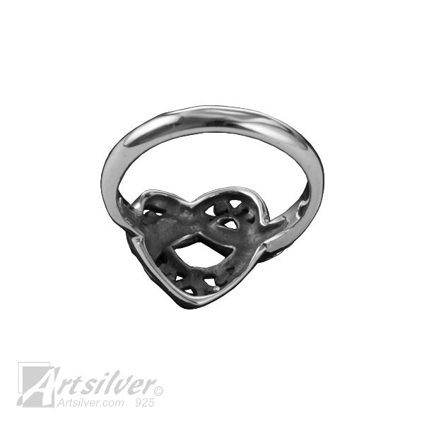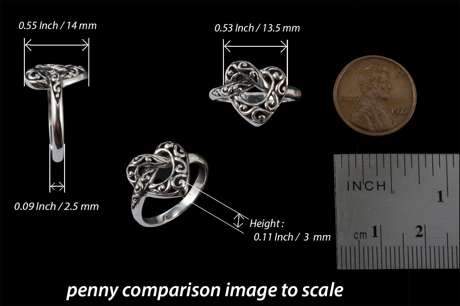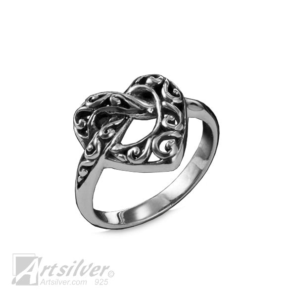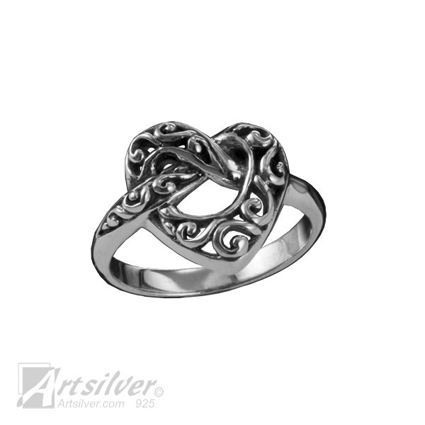 Celebrate Valentines Day everyday when you put this lovely ring on your finger!!  A high polished band that branches out into a filigreed entwined large heart at the center of this beauty. The heart is created with oxidated sterling silver. Here is a piece that will have a place in your heart always.