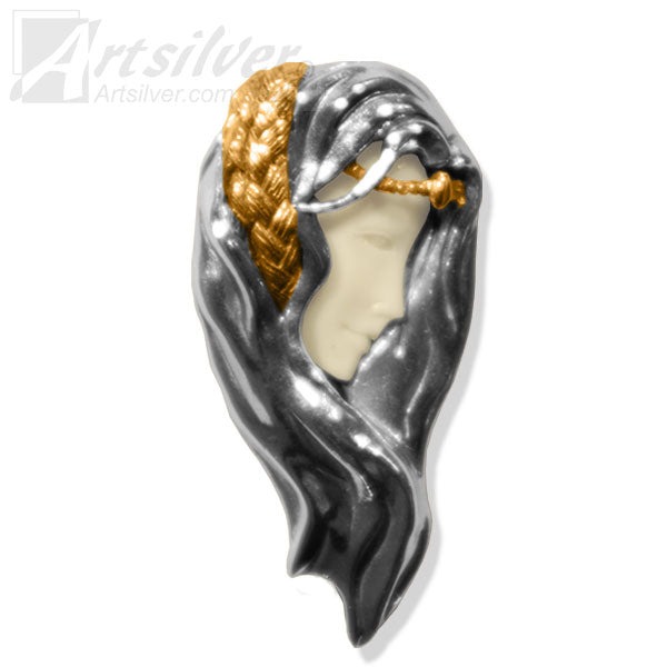 This unique piece shows the profile of a face.The head ornament and hair braid is plated 18 karat gold.