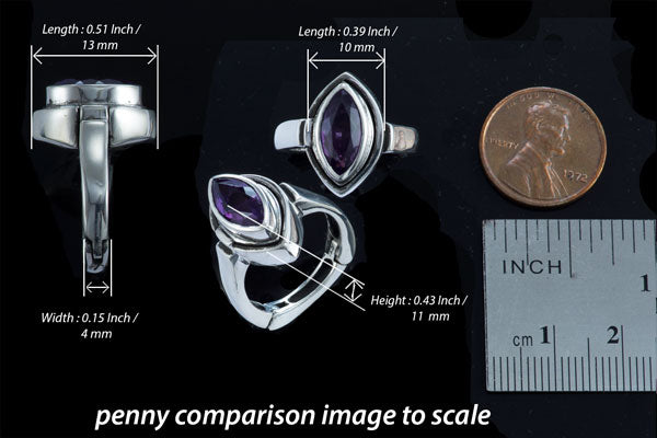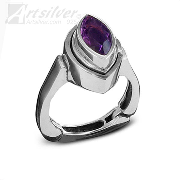 This sterling silver beauty has a teardrop gemstone surrounded by a layered collar of sterling silver. The silver gradually gets thicker as you move down from the substantial gemstone. This ring is timeless and will go with everything. The magnet is hidden behind the gemstone and connects with the thick silver base. It fits around your finger with comfort. Truly a ring that will be coveted because of its regal appearance. The ring is available in Amethyst (purple), Blue Topaz, Garnet (red), Onyx (black) and Paradot (green).gemstones.